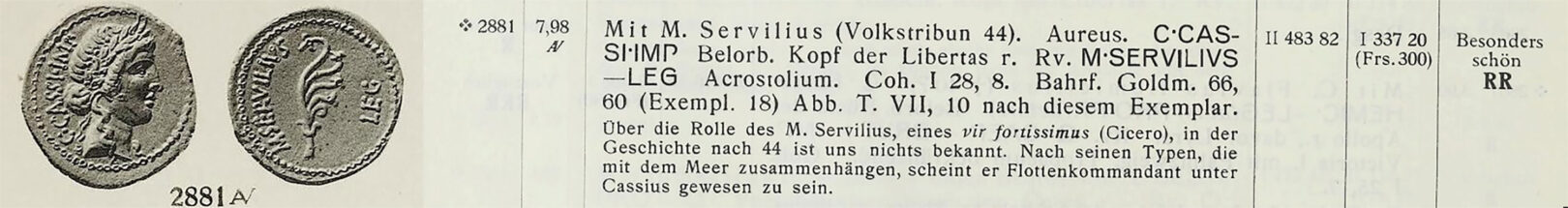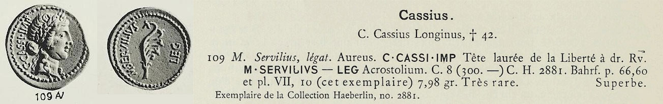 Der Cassius Aureus gelangte dann in die Sammlung des berühmten deutschen Numismatikers Ernst Julius Haeberlin (1847–1925), einem Experten für römische Münzen aus der Zeit der Republik und Autor des 1910 erschienenen Standardwerks „Aes Grave, das Schwergeld Roms und Mittelitaliens“.