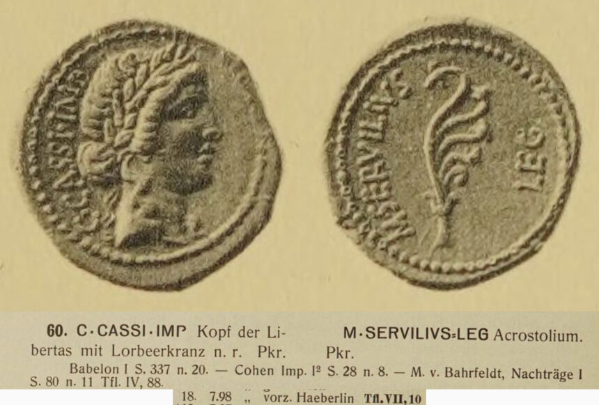 Während sich der Cassius Aureus im Besitz von Haeberlin befand, gelangte er in die Hände von Dr. Max von Bahrfeldt, der die Münze als einziges Exemplar ihrer Art in seinem Nachschlagewerk „Die römische Goldmünzenprägung während der Republik und unter Augustus“ von 1923 veröffentlichte.