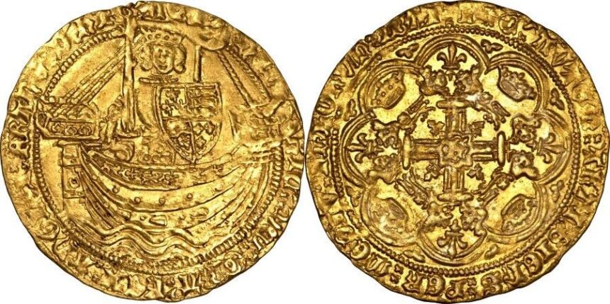 de pie sobre un barco, una representación que simbolizaba tanto la fuerza marítima de Inglaterra como la autoridad real. El reverso estaba diseñado con un escudo cruzado o una cruz floral, lo que enfatizaba la conexión con los motivos cristianos y la legitimidad política.