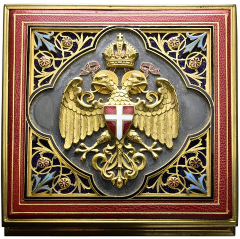 La médaille était présentée dans un coffret en bois richement décoré, recouvert de cuir et dont les bords étaient estampés à l’or. Le couvercle est orné d’un médaillon octogonal représentant un aigle à deux têtes couronné et les armoiries émaillées de Vienne. L’intérieur est doublé de soie et de velours bleu, et le couvercle se ferme à l’aide d’un bouchon à vis, un détail particulièrement raffiné.