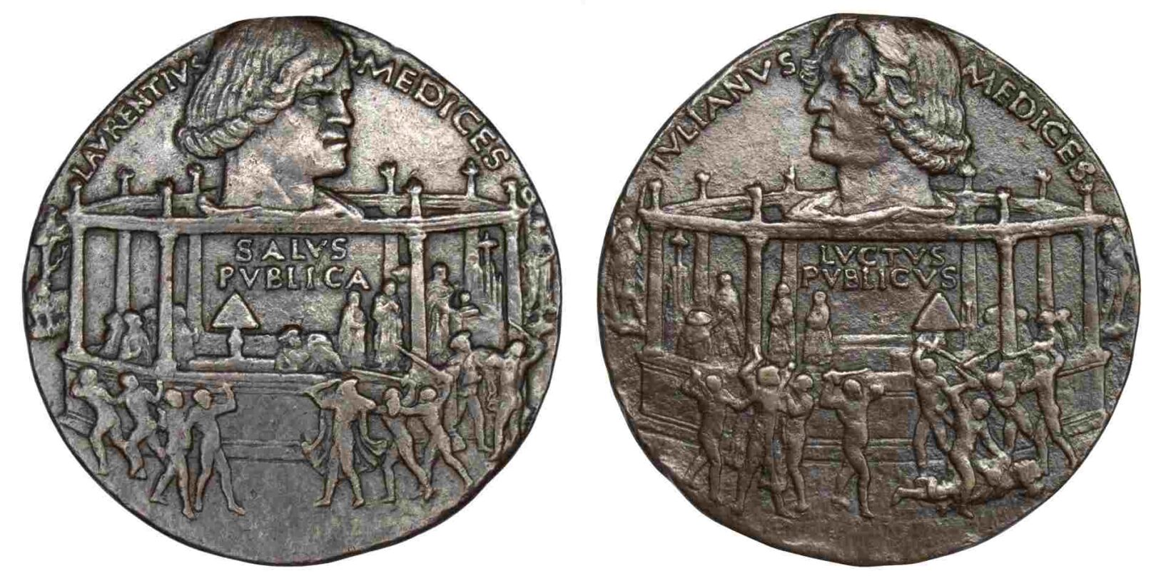 Une face est consacrée à Laurent, qui a survécu, l’autre à Giuliano de Médicis, qui a été assassiné. Les deux faces présentent un portrait dans le tiers supérieur, accompagné respectivement des inscriptions LAVRENTIVS MEDICES et IVLIANVS MEDICES. Sous le portrait de Laurent figure la mention SALVS PVBLICA (= bien public), et sous celui de Giuliano, LVCTVS PVBLICVS (= deuil public).