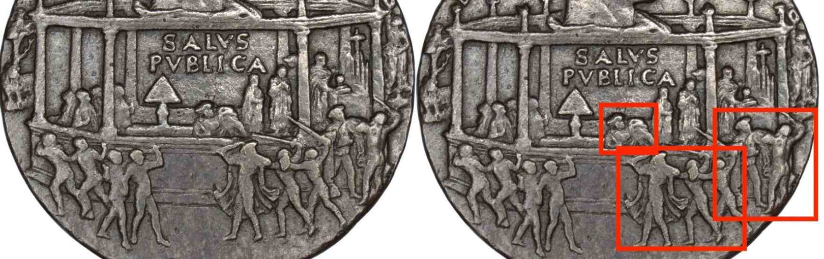 Ils n’avaient pas prévu les préparatifs de Laurent. Sur la médaille, il se défend avec une épée et une cape flottante (qui jouera bientôt un rôle), tandis que deux assassins le poursuivent. Leurs coups d’épée le blessent au cou, mais pas gravement. Dans le champ de gauche, l’horreur des spectateurs est largement exprimée, certains restant sans voix, d’autres fuyant l’église.