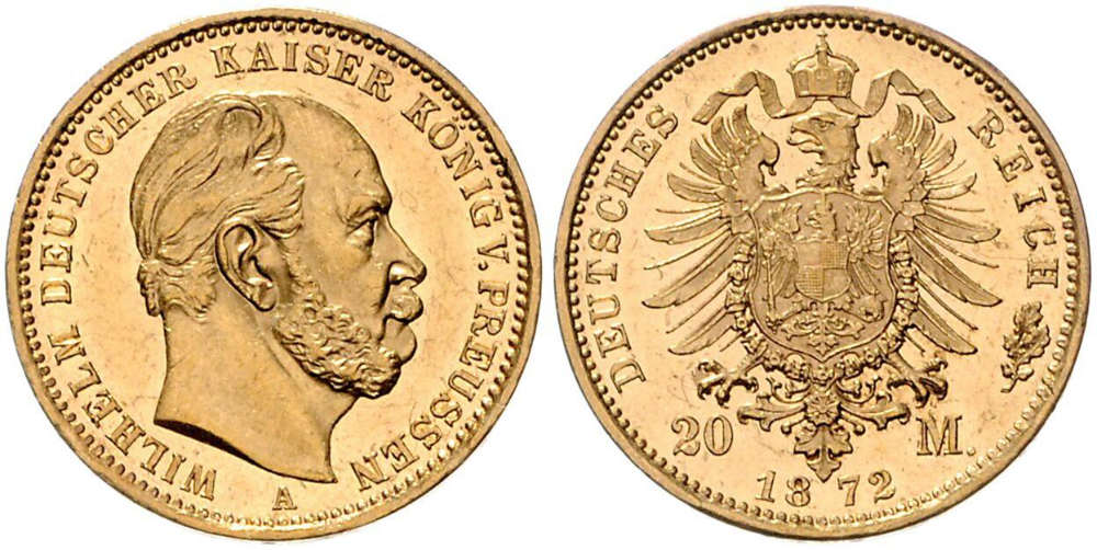 L’or arriva juste à temps pour être utilisé à la frappe des nouvelles pièces impériales. En effet, le 4 décembre 1871, le Reichstag adopta la « Loi relative à la frappe des pièces d’or impériales ». Par là, le gouvernement allemand opta pour l’étalon-or. Au cours des décennies précédentes, l’or s’était révélé nettement plus stable en valeur que l’argent, principalement en raison des riches gisements d’argent du Nevada. Ainsi, l’article 1 de la nouvelle loi stipulait que 139,5 pièces de la nouvelle monnaie impériale devaient être frappées à partir d’une livre d’or fin ; un dixième de cette quantité — selon l’article 2 — devait être appelé « mark » et divisé en 100 pfennigs. En d’autres termes : la loi a d’abord établi la pièce de 10 marks avant de traiter de la pièce de 20 marks.