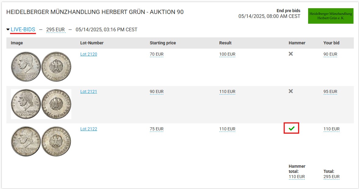 L’un des principaux avantages est la transparence totale. Toutes les enchères placées et les lots remportés s’affichent automatiquement dans votre compte utilisateur personnel sur Sixbid. Les enchérisseurs peuvent voir en un coup d’œil les enchères auxquelles ils ont participé et les lots qu’ils ont remportés.