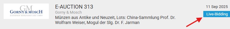 Toutes les enchères avec enchères en direct sont accessibles via la page d’accueil de Sixbid. Elles sont identifiables grâce au bouton bleu « enchères en direct », qui indique clairement la possibilité de participer en direct. Pour plus de clarté, nous avons également répertorié toutes les enchères en direct en cours dans la colonne d’informations de droite, ce qui permet aux enchérisseurs d’accéder directement à toutes les enchères pertinentes à tout moment.