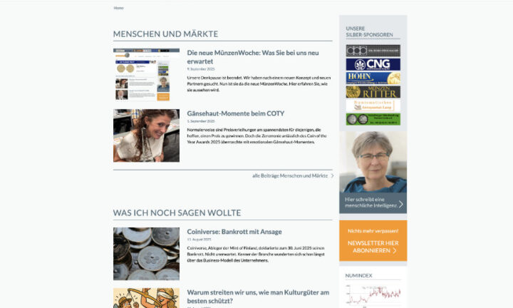 La pause réflexion est terminée. Ursula Kampmann a cherché un nouveau concept et de nouveaux partenaires. La nouvelle MünzenWoche / CoinsWeekly est désormais disponible.