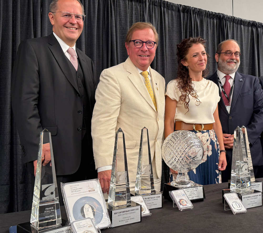 Les lauréats des COTY Awards 2025 : De gauche à droite : DI Dr Manfred Matzinger-Leopold (Monnaie autrichienne), Tom Uram (président de l'ANA), Chiara Principe (créatrice de pièces pour le Vatican, entre autres), Marc Schwartz (Monnaie de Paris). Photo : UK